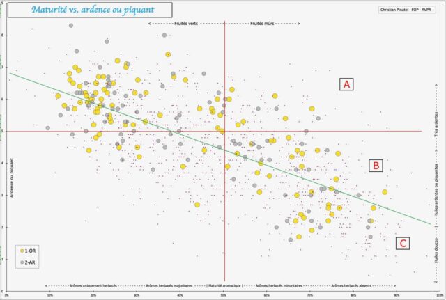 Voici une représentation à partir des résultats des années antérieures du concours de l’AVPA avec une répartition des médailles selon la maturité et l’intensité. Chaque point représente une huile ; la droite verte indique la tendance générale montrant une diminution de l’ardence lorsque la maturité aromatique augmente. Les points jaunes correspondent aux huiles médaillées d’or, les gris aux médaillées d’argent.Si une tendance à la baisse de l’ardence avec la maturité apparaît, la dispersion des points montre qu’il existe des huiles de fruité mûr présentant une ardence notable, y compris parmi les huiles primées.